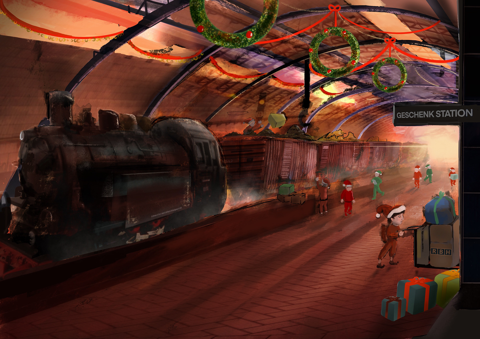 Der „RBH-Express“ und der Weihnachtsbahnhof sind als Cover für die Weihnachtsausgaben des Mitarbeitermagazins, für Social Media und als Geschenk für die Jubilare als Plakat Illustriert worden.